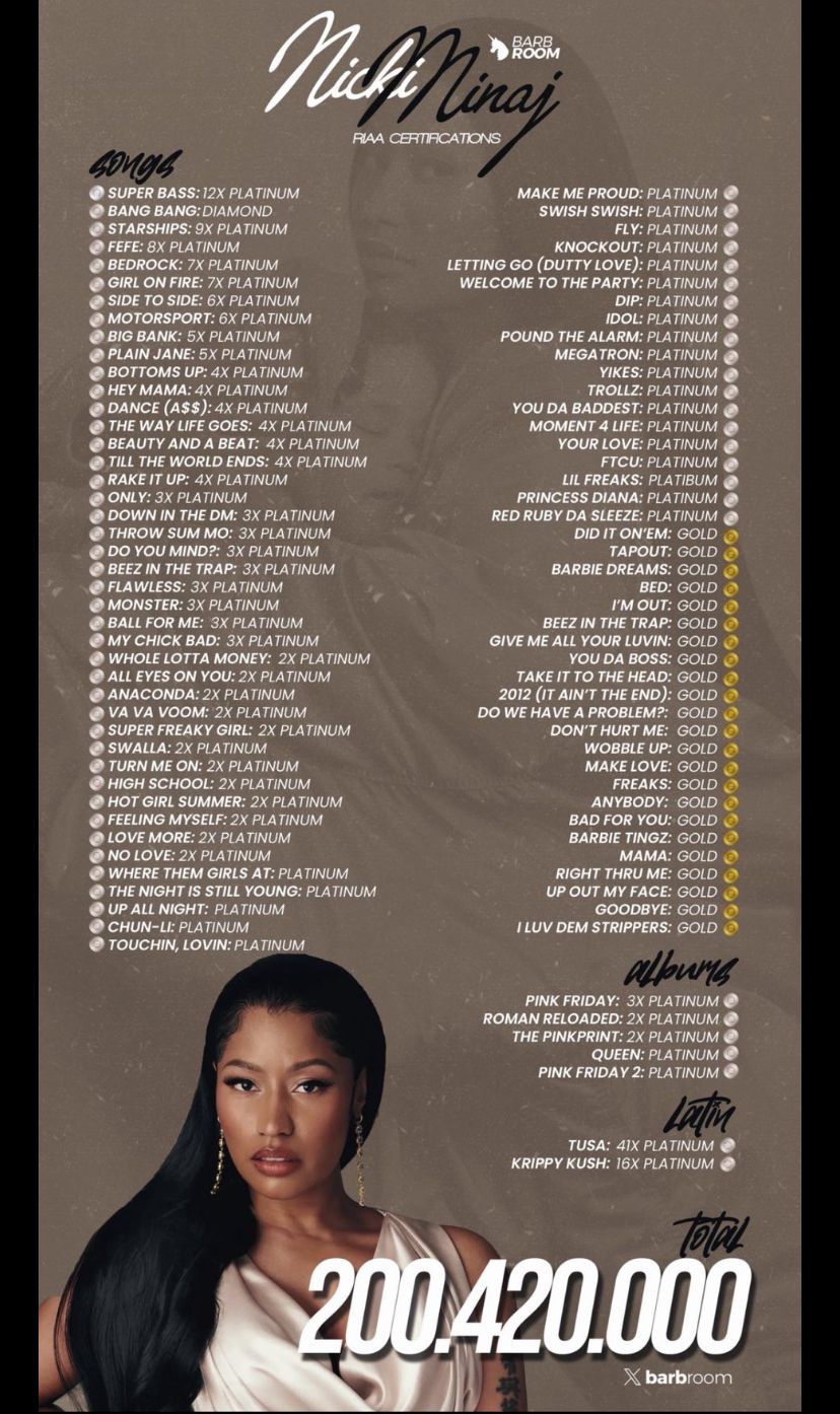 It’s possible that the RIAA certifications for her singles haven’t been fully updated because she’s keeping the industry off-balance. By letting numbers lag, by letting the headlines skip over her, Nicki is quietly letting her legacy grow while the industry underestimates her.